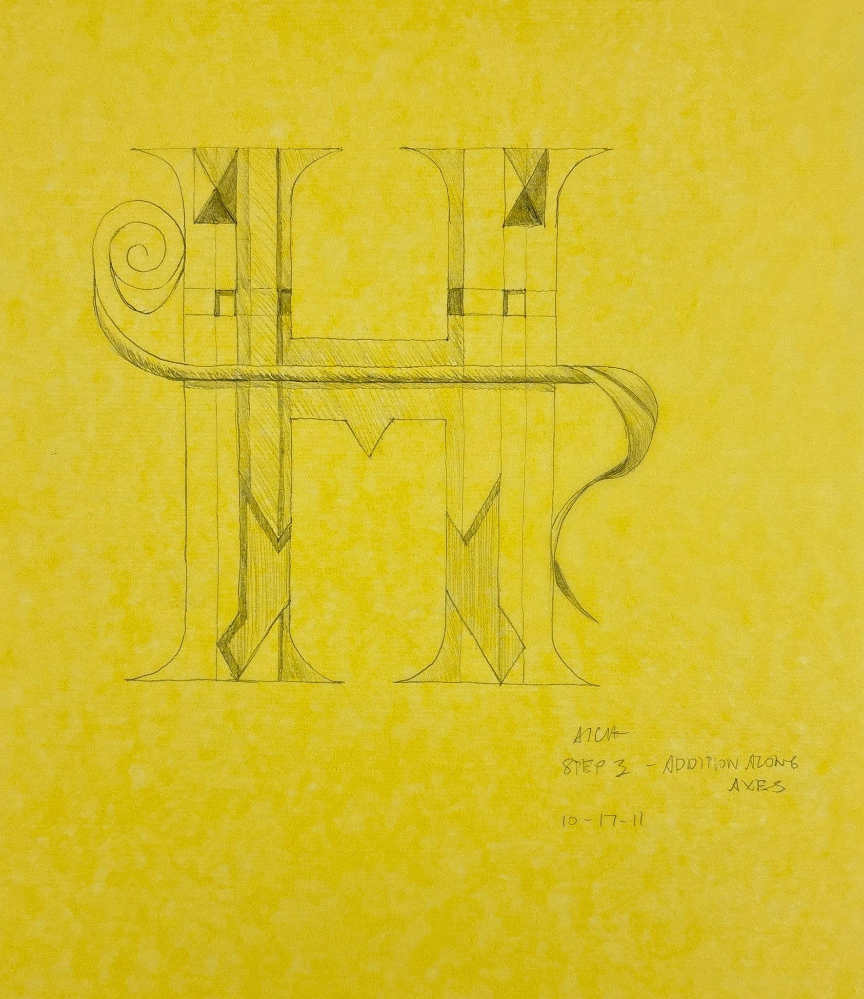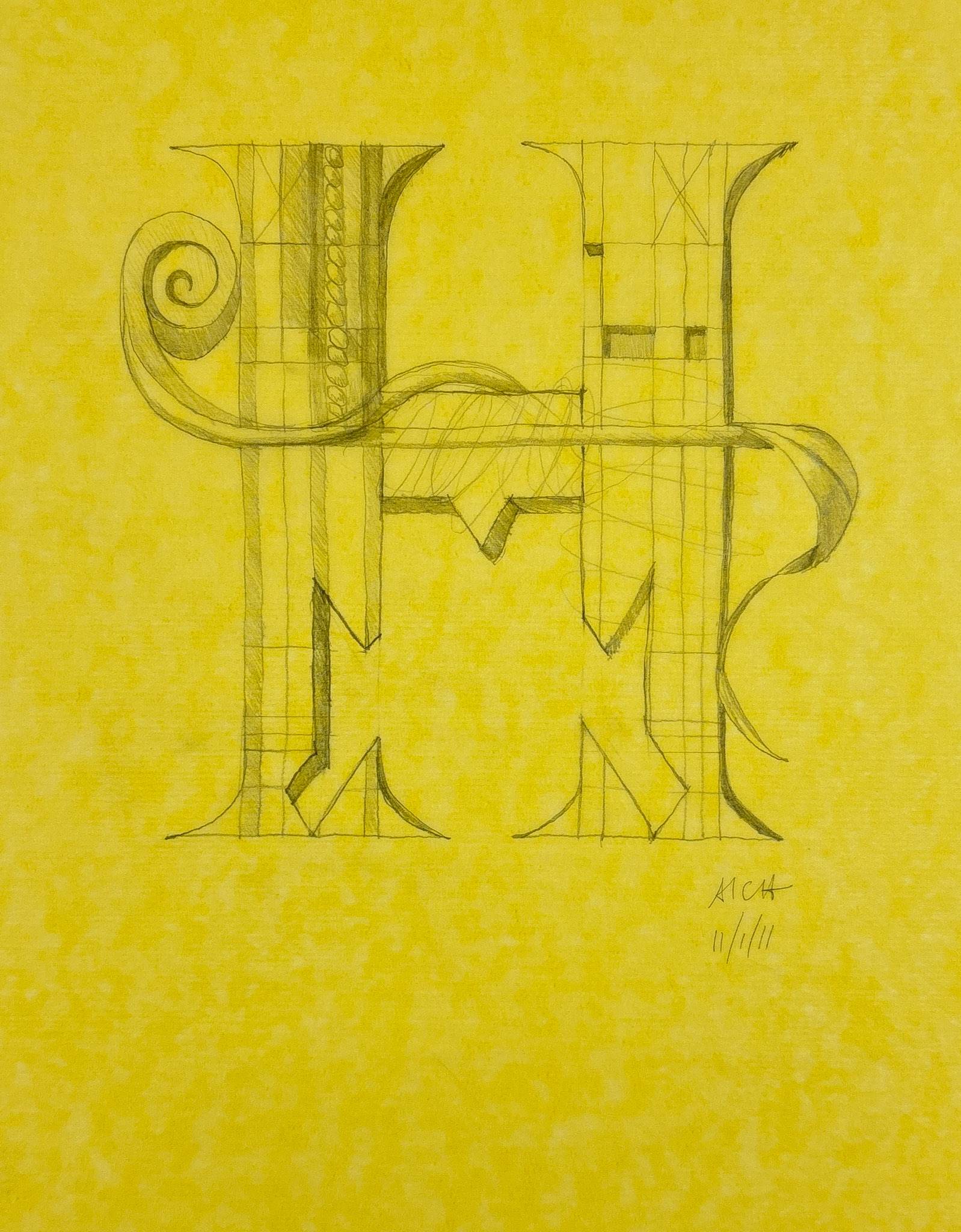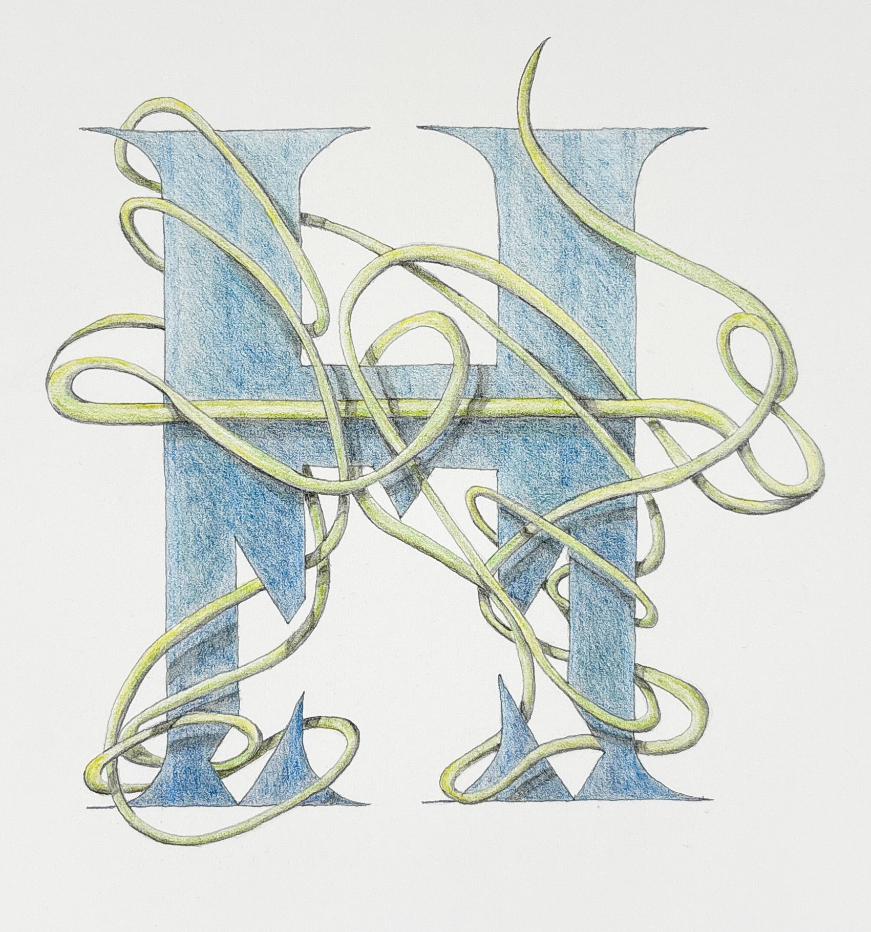 While exploring ways to illustrate letters with imaginary botanical motifs (see Shernyblock Letters for an entire alphabet), I did this study for the letter H. The final drawing is shown first, then the preparatory sketches in order.