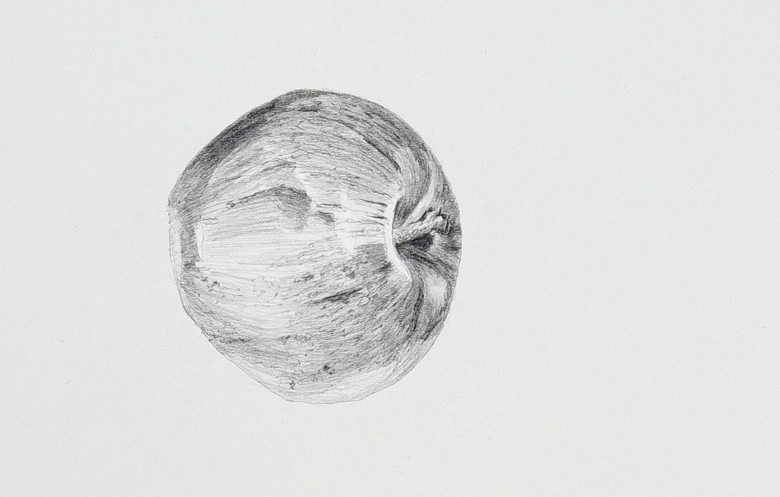 Apple, second version; graphite, 7 x 5 inches, 2003. This was my first botanical illustration assignment. On the first day of class, we had 20 minutes to draw an apple. Six weeks later, we drew an apple again in 20 minutes and then compared the two drawings during the critique. Rather than showing my first version, let's just say that I learned a lot in those six weeks!