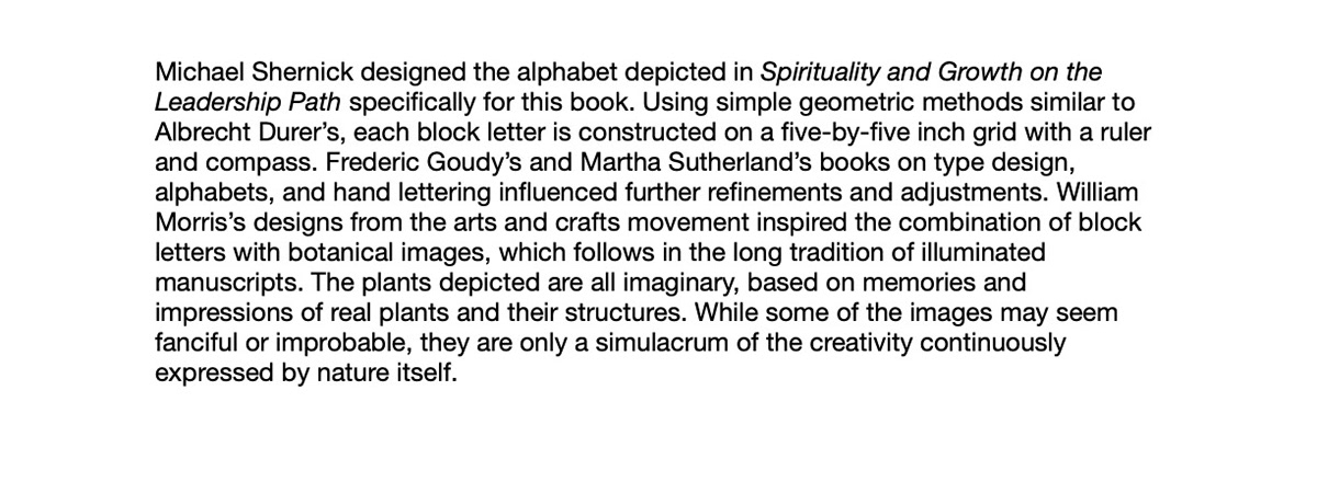 I illustrated Spirituality and Growth on the Leadership Path: An Abecedary, written by Dr. Deborah J. Haynes, in 2005. This is the colophon from the book; an explanation of my design process to create what I call Shernyblock Letters.