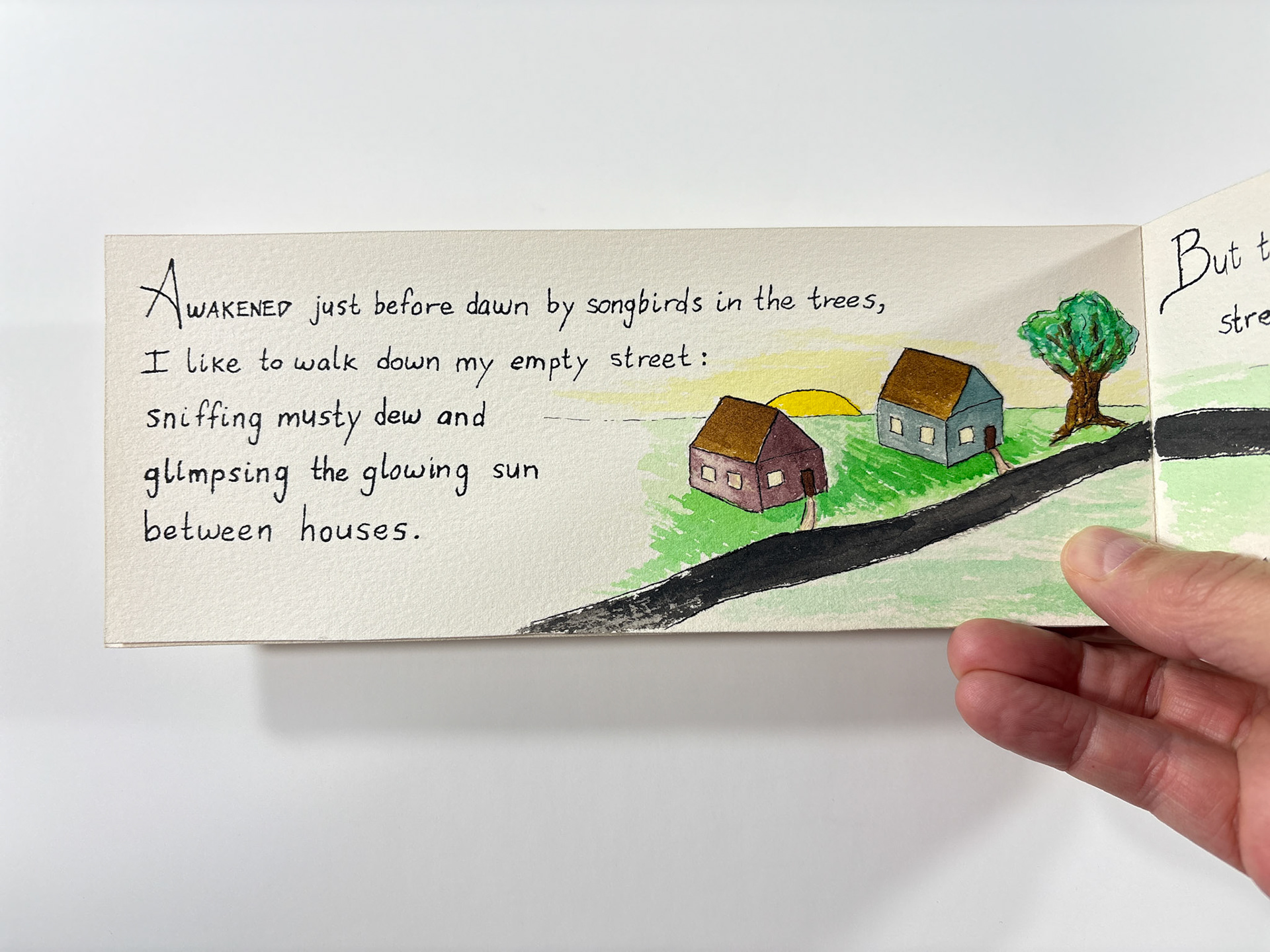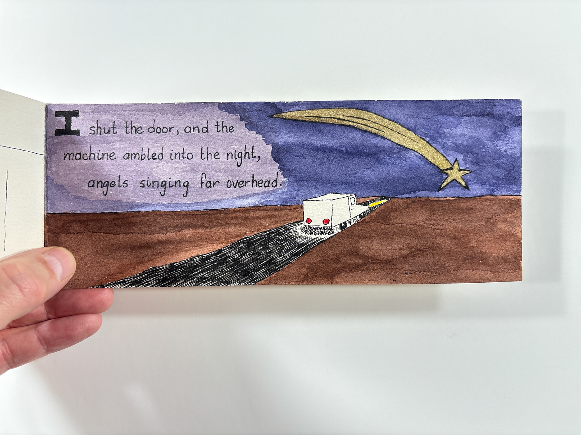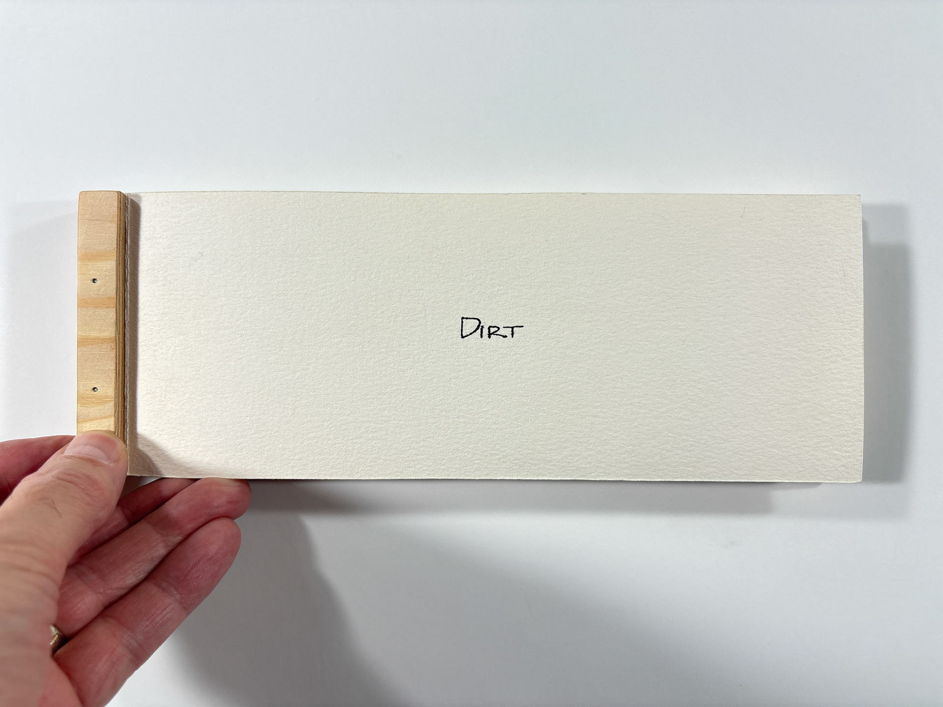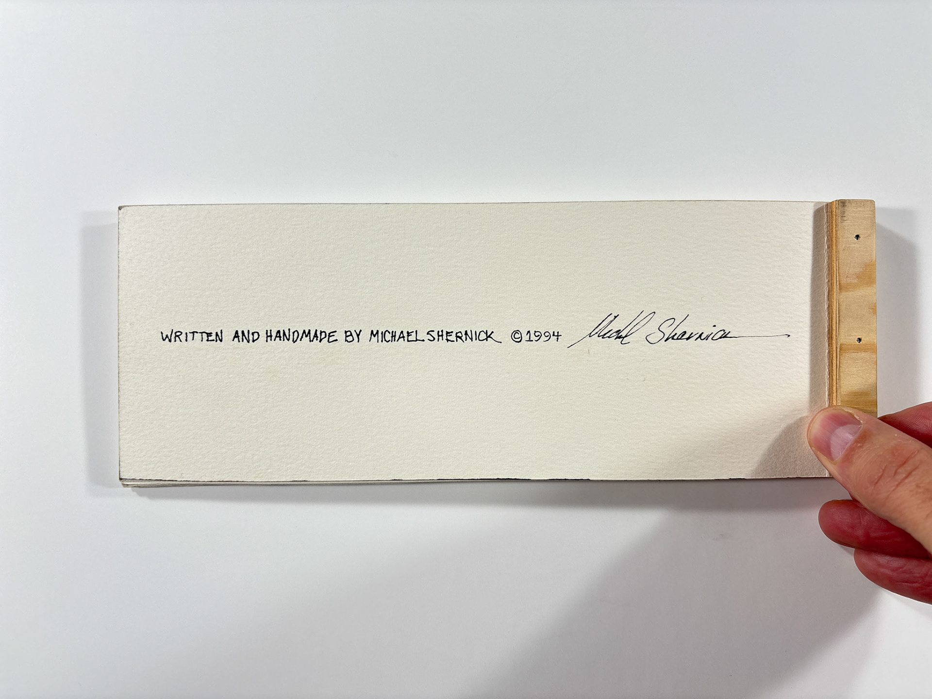 I made this book in 1994. It's pen and ink and watercolor. The closed dimensions are 3.5 x 9.5 inches. The binding is two small strips of plywood, nailed together through the paper with brads. Collection of the artist.