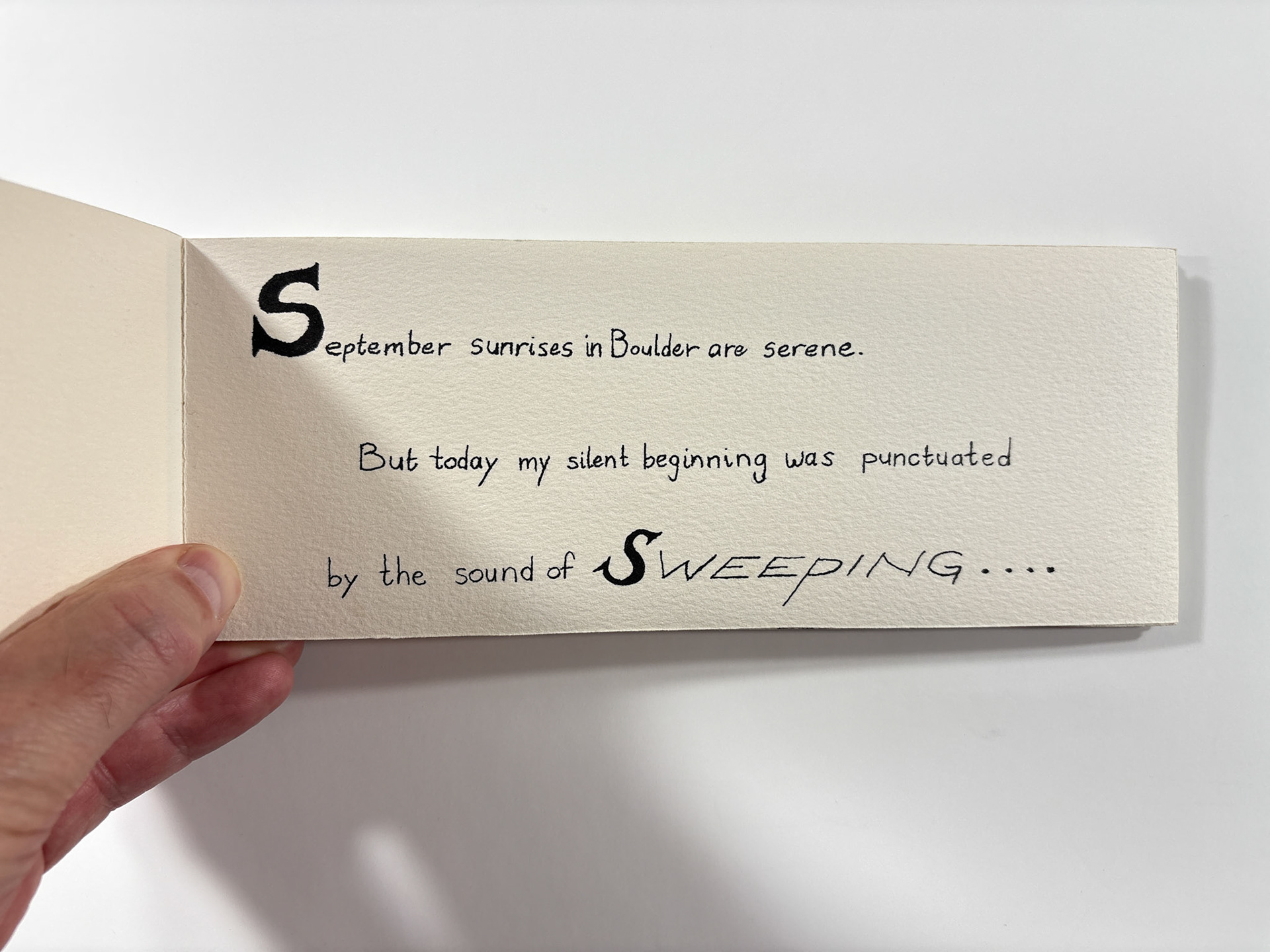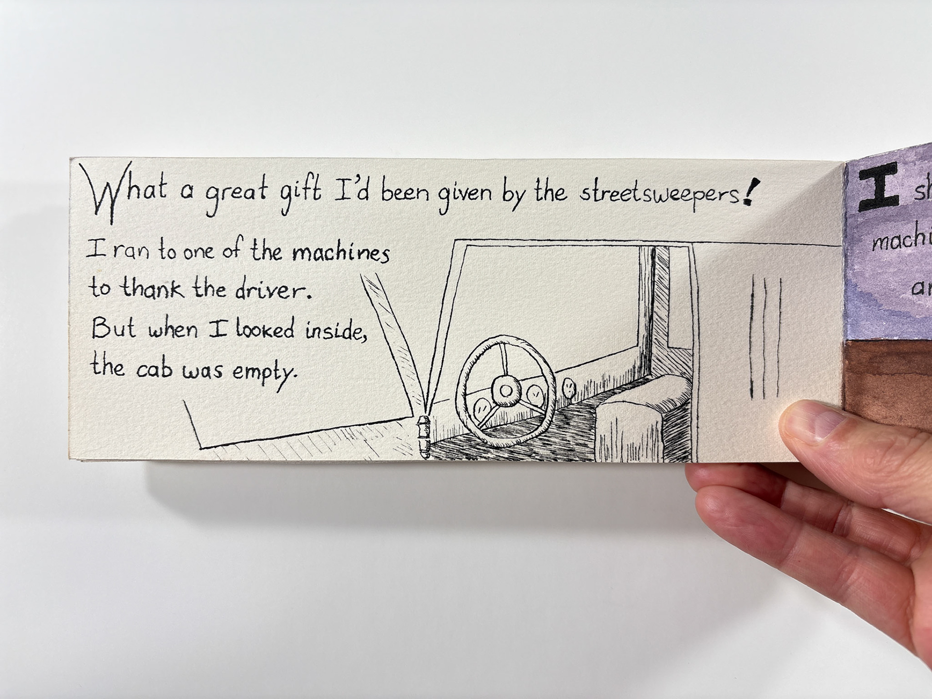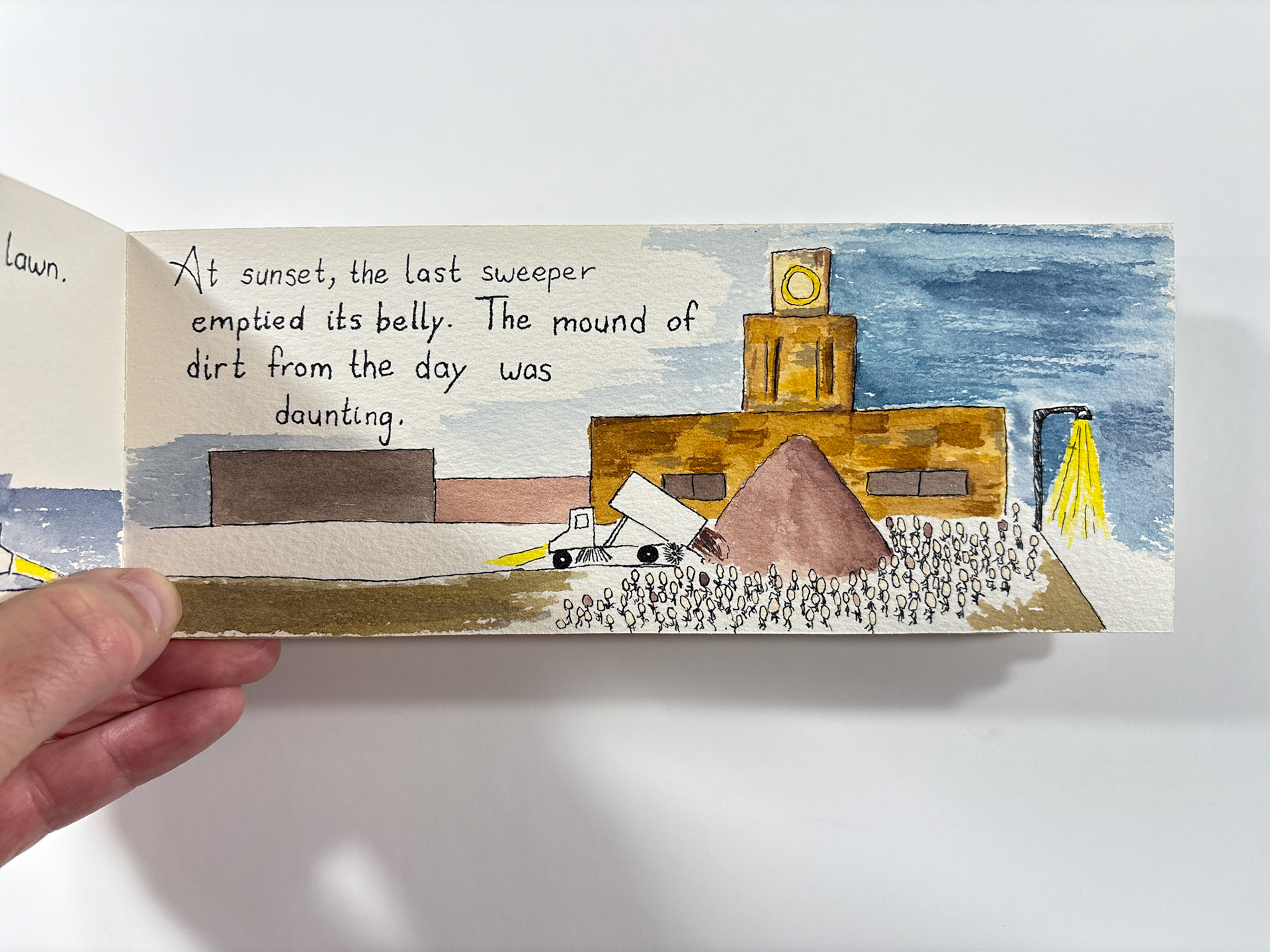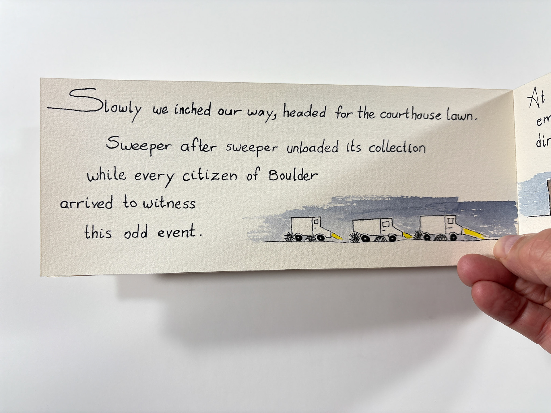I made this book in 1994. It's pen and ink and watercolor. The closed dimensions are 3.5 x 9.5 inches. The binding is two small strips of plywood, nailed together through the paper with brads. Collection of the artist.