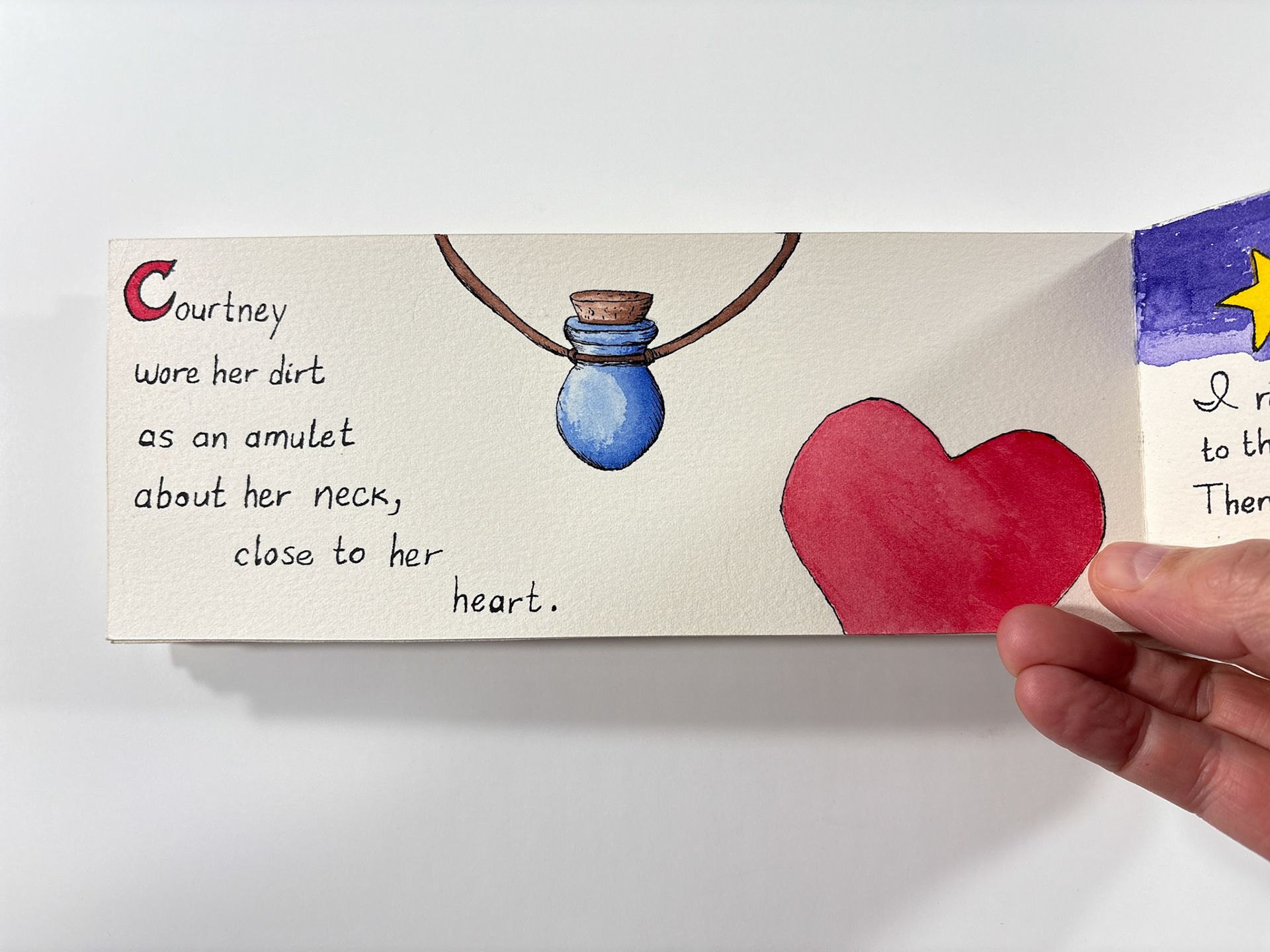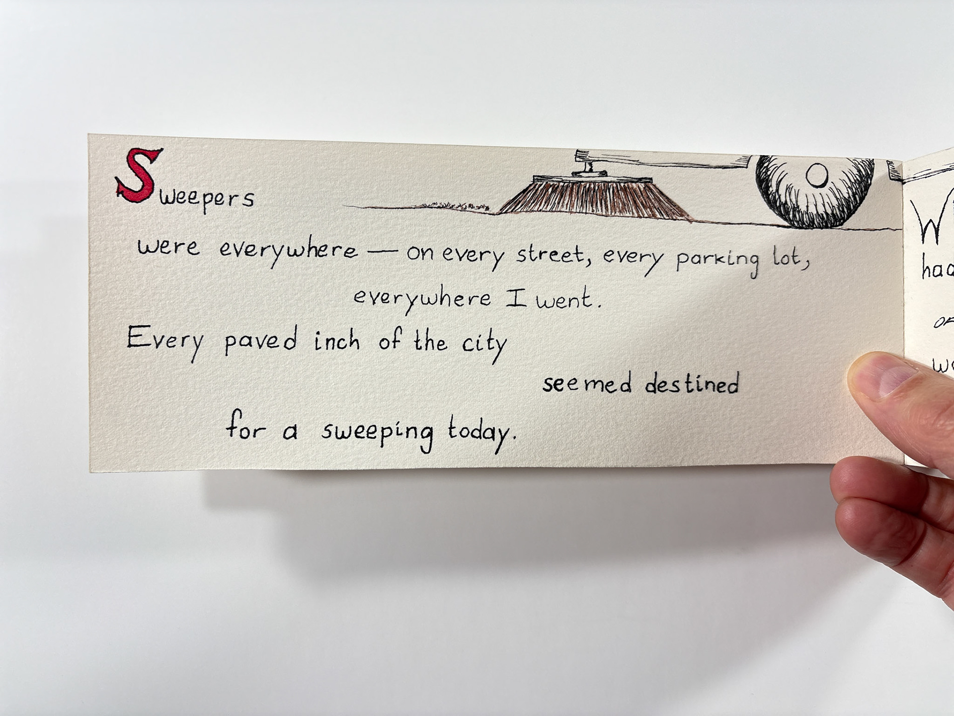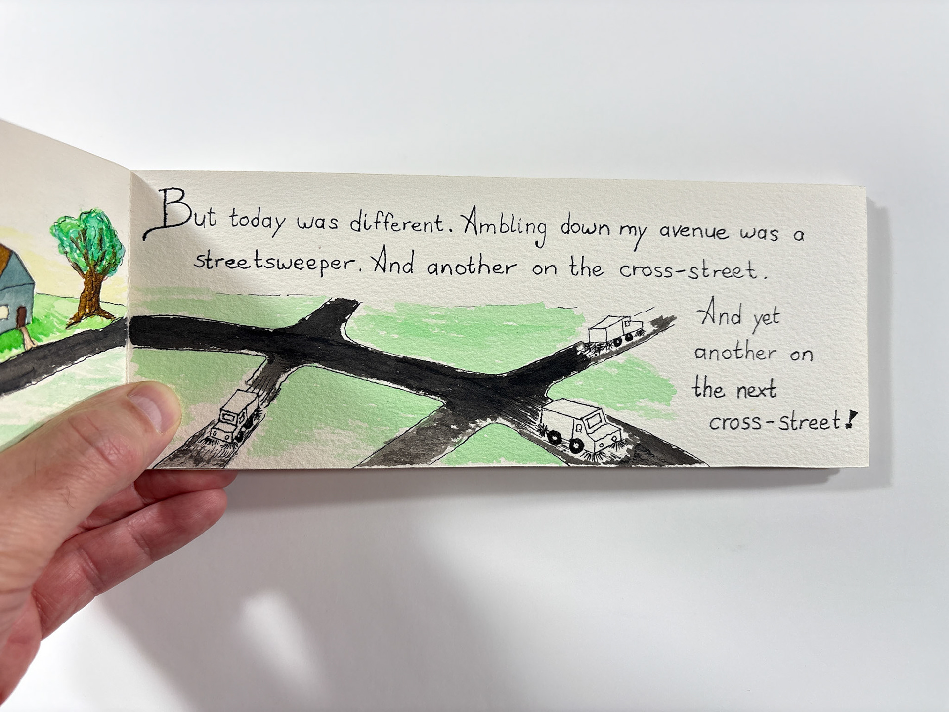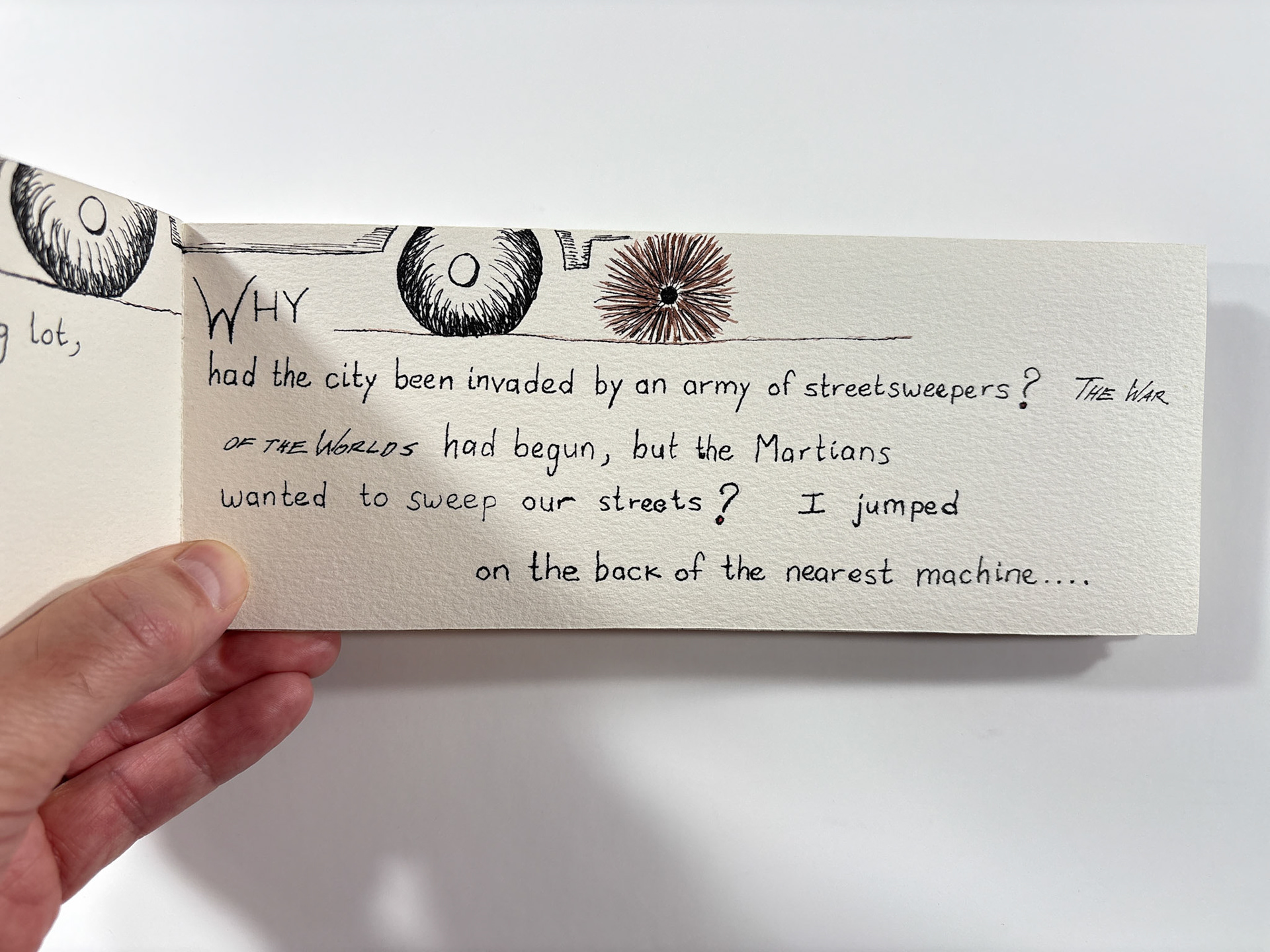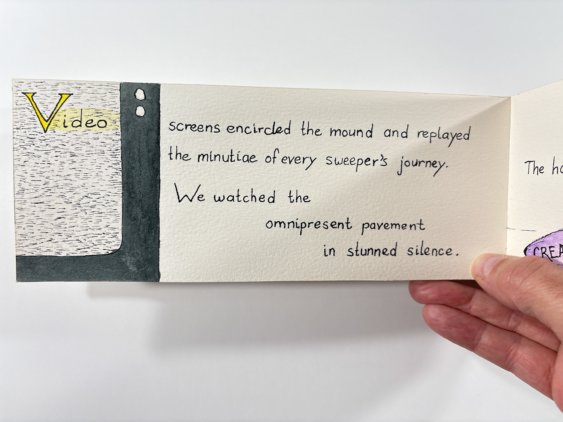 I made this book in 1994. It's pen and ink and watercolor. The closed dimensions are 3.5 x 9.5 inches. The binding is two small strips of plywood, nailed together through the paper with brads. Collection of the artist.