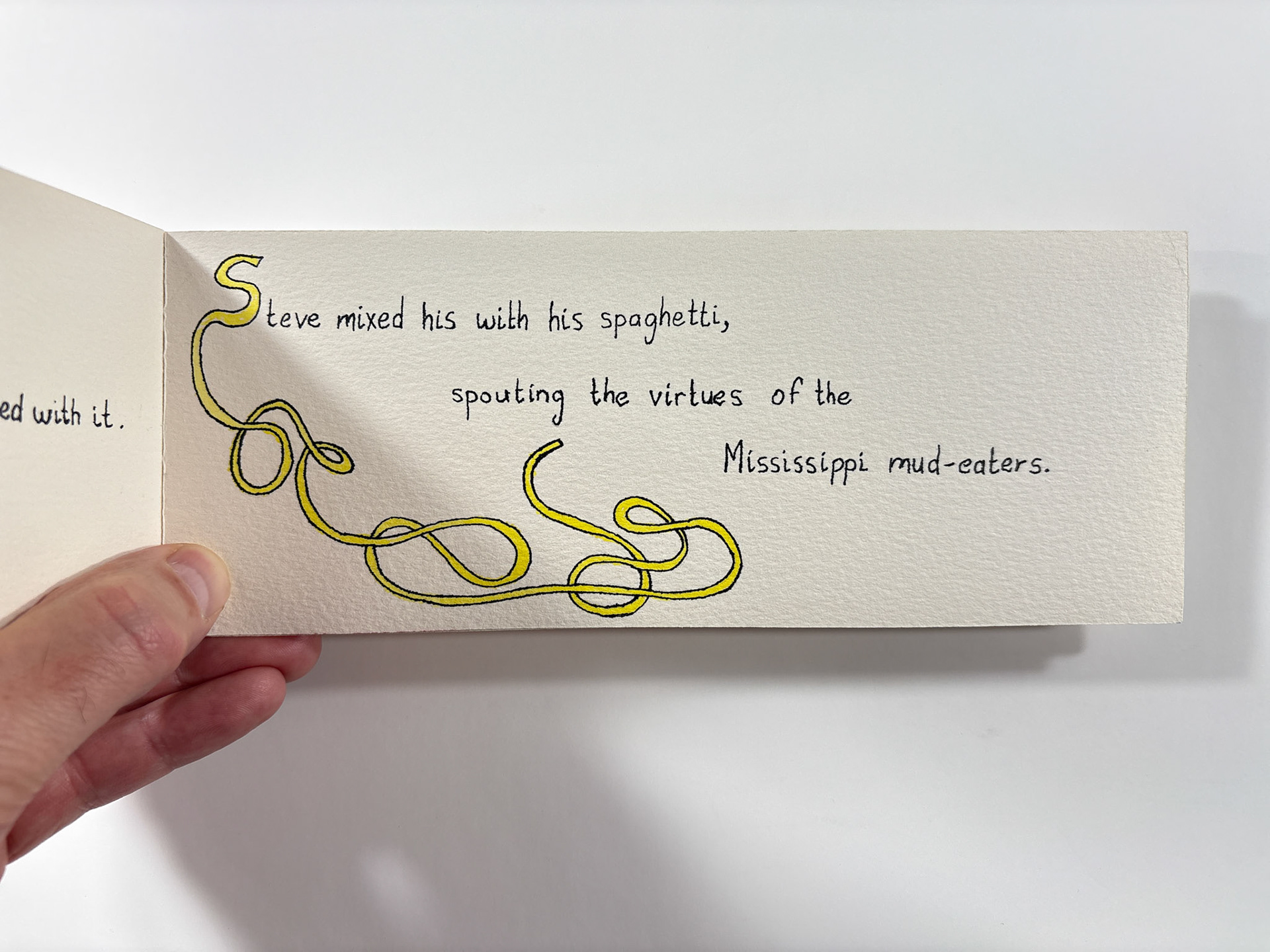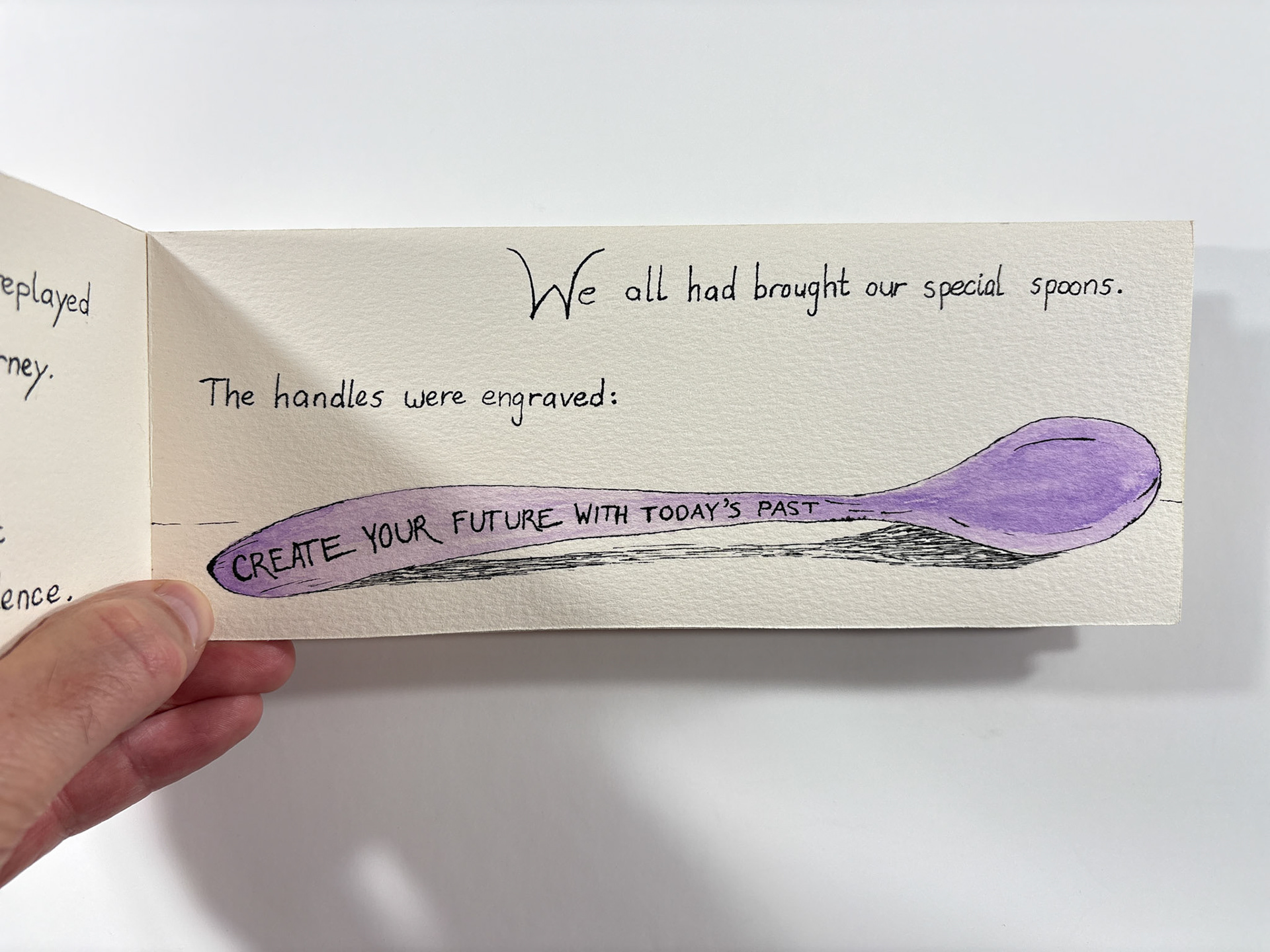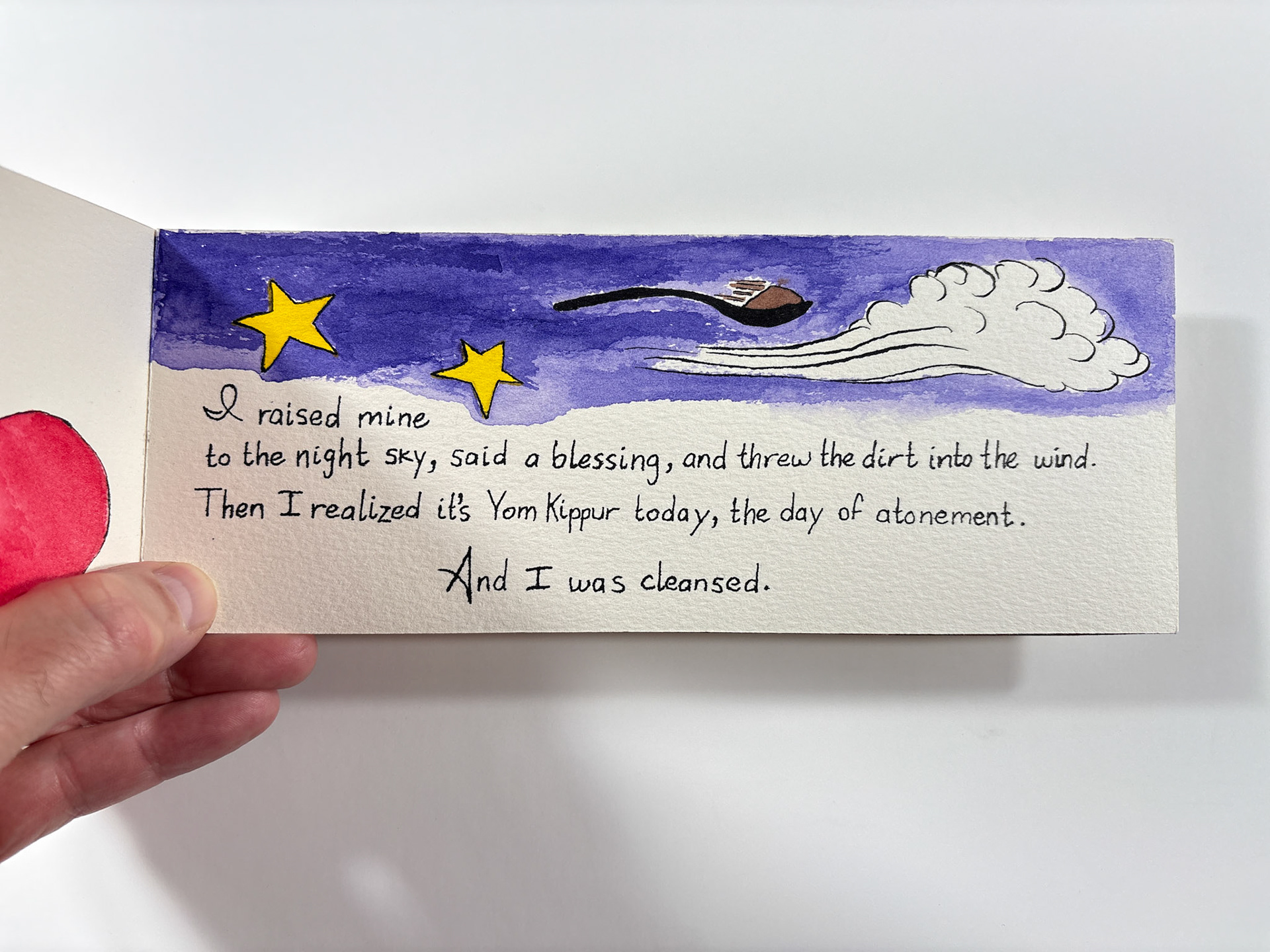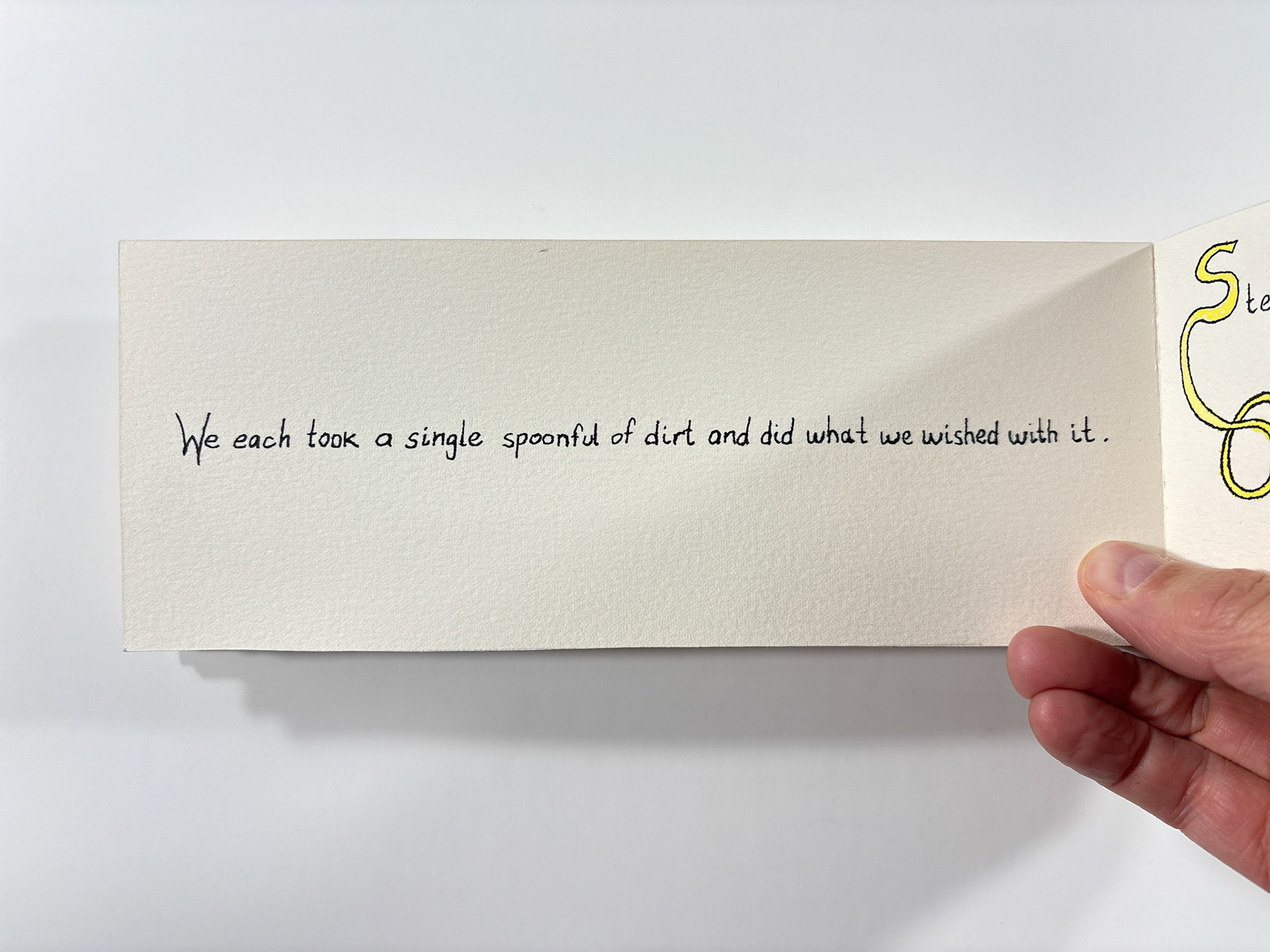 I made this book in 1994. It's pen and ink and watercolor. The closed dimensions are 3.5 x 9.5 inches. The binding is two small strips of plywood, nailed together through the paper with brads. Collection of the artist.