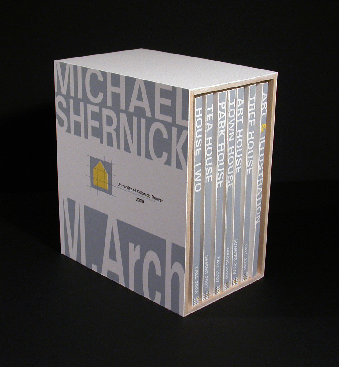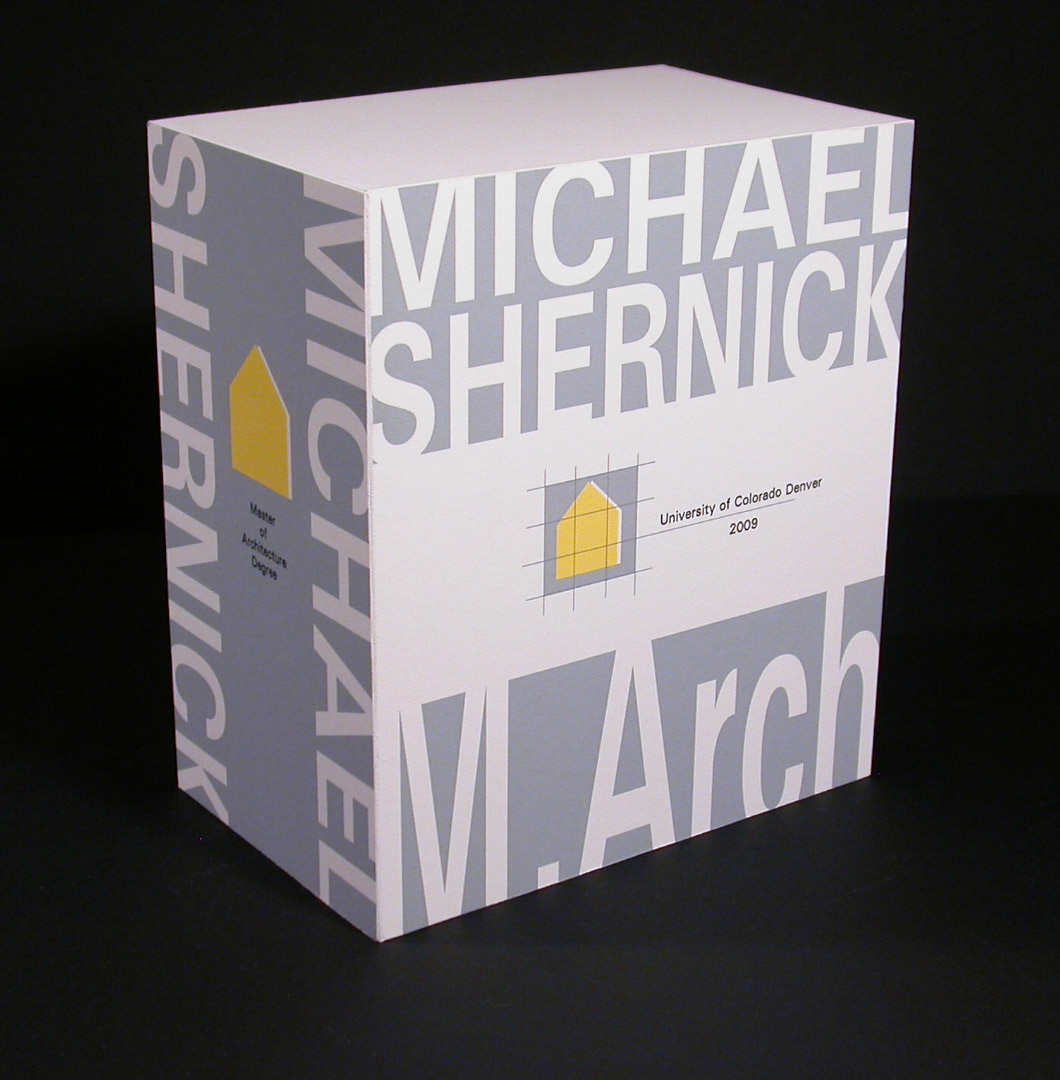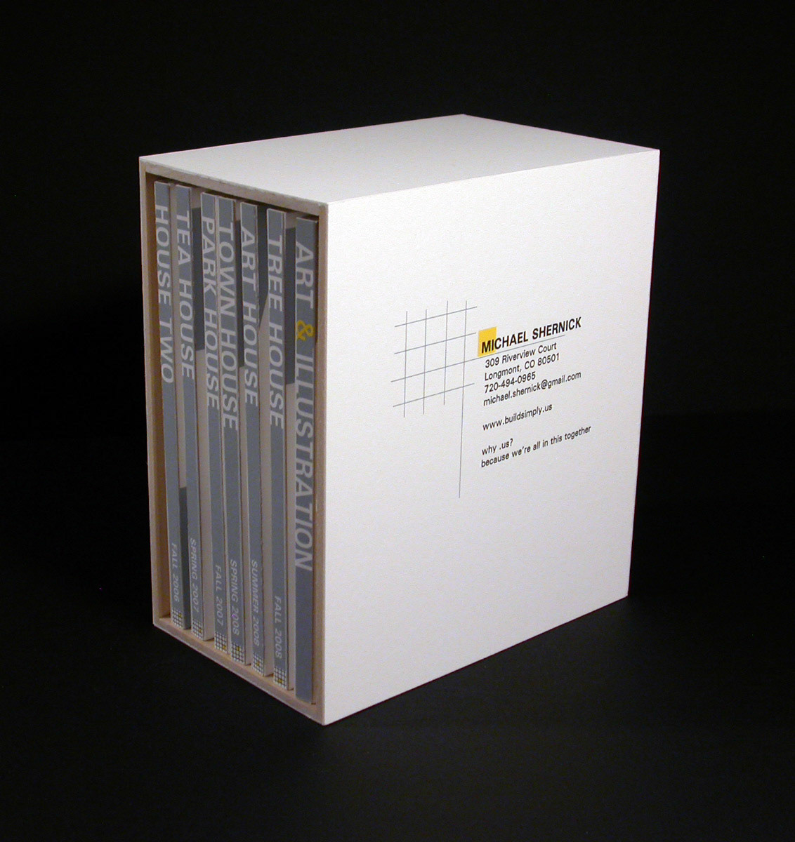 The following shows my final portfolio: A basswood box with inkjet-printed mat board covers, which holds a booklet for each studio and other sections of the portfolio. The booklets are based on CD or DVD inserts which are folded in order to have multiple pages fit into the standard size. I accomplished this by printing the booklet on both sides of a strip of mat board, then scoring it in just the right places to create the folds.