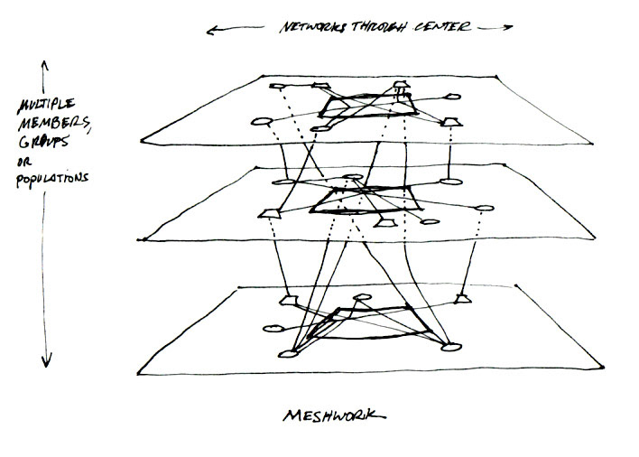 The diagram below was for Human Factors, a class where we studied how people interact with the built environment and each other. This is my attempt to show a network of networks and how people might interact through them, in what I dubbed a "meshwork". See the research paper I created this for here: Social Capital: Gated Communities vs. Woonerven