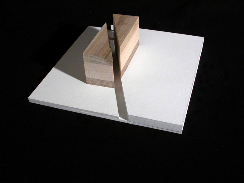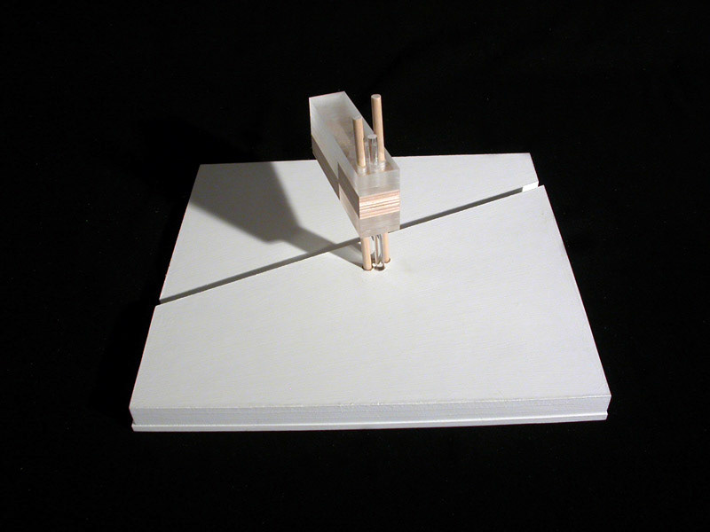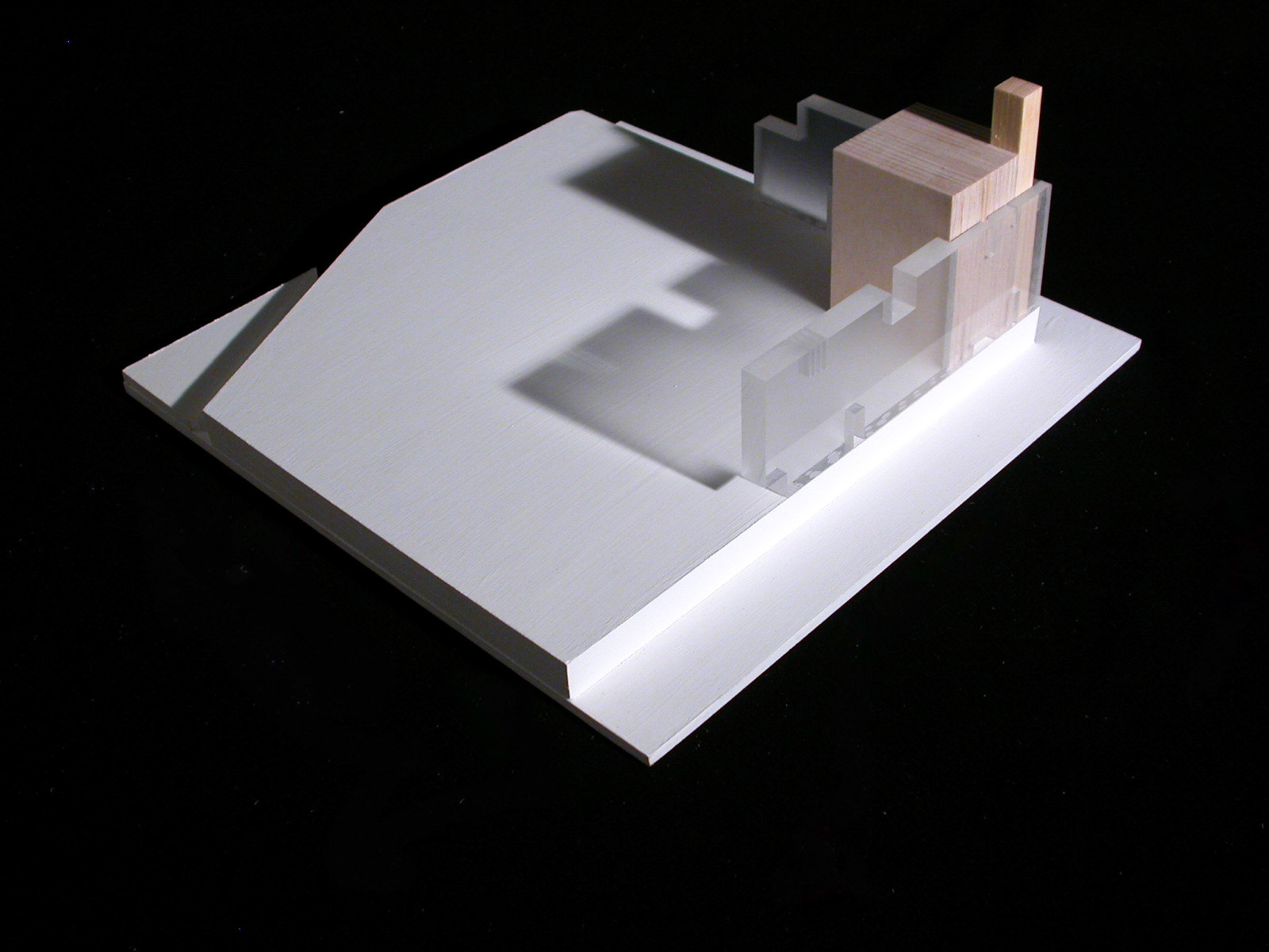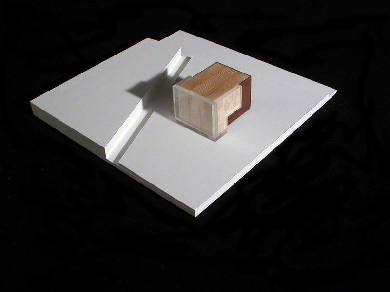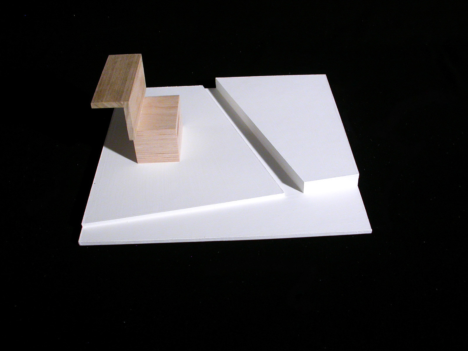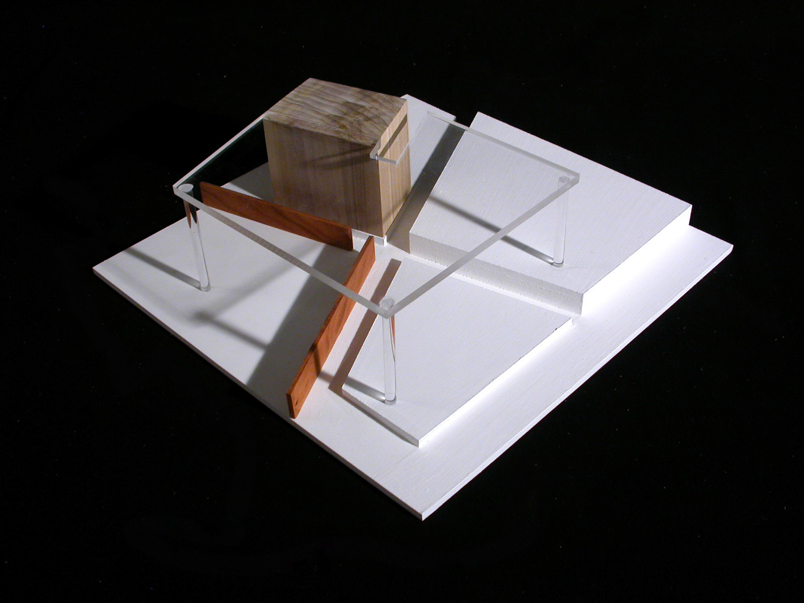 As part of the Tea House project, we had to build a site model, then make 10 models in 10 days of tea house concepts, each expressing one of Le Corbusier's five elements of architecture and at least one design approach, such as subtraction. Each model had to be on a white gessoed base and could use wood and plexiglas.