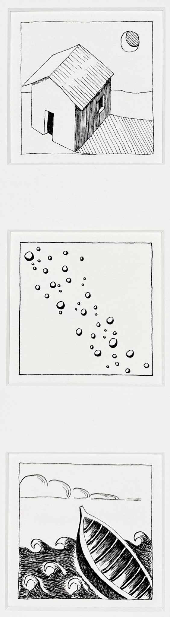 Triptych: The House, Water Breath, The Boat; pen and ink, 3 x 3 inches each, 3.5 x 13.5 inches overall, 1996