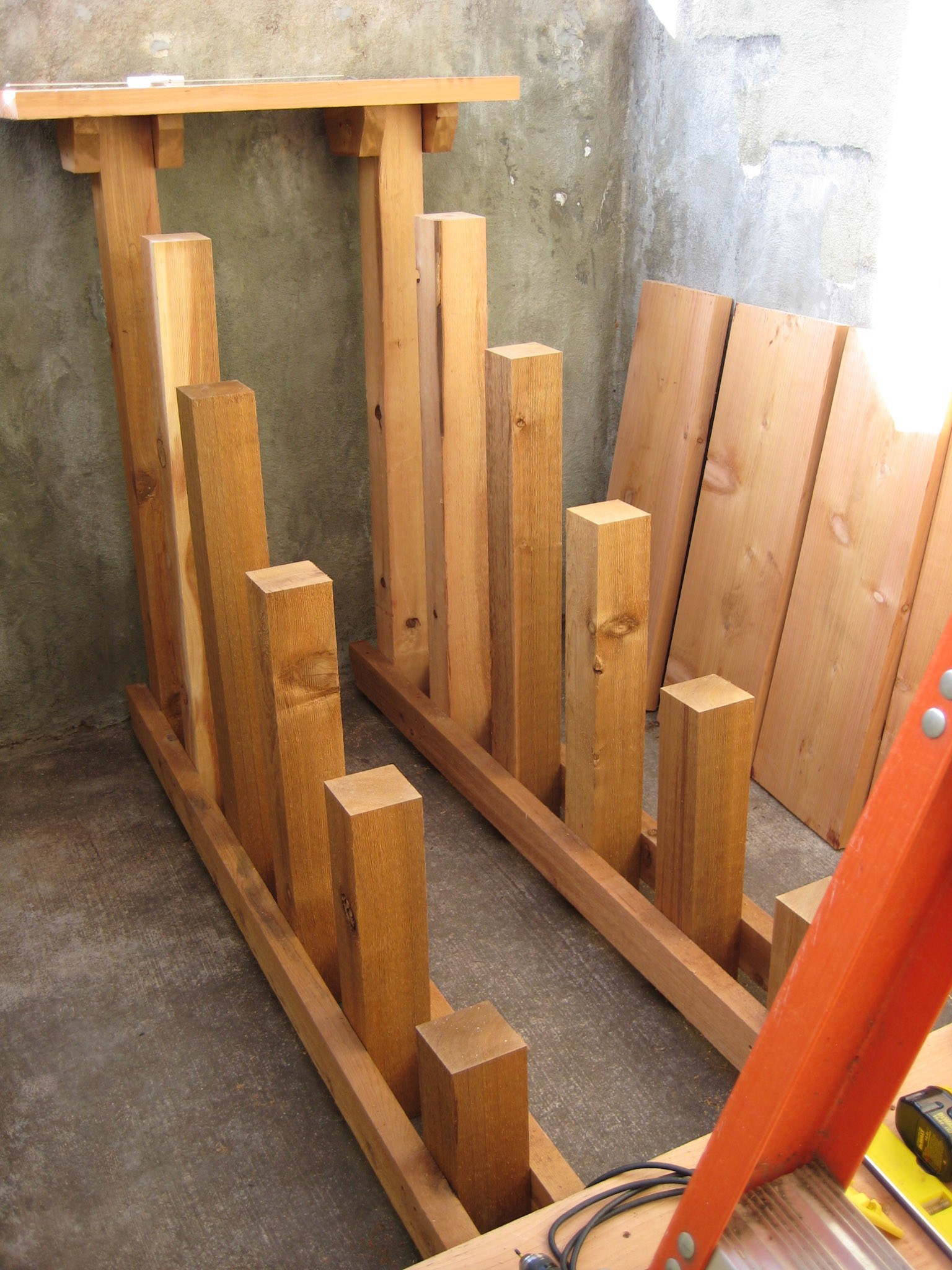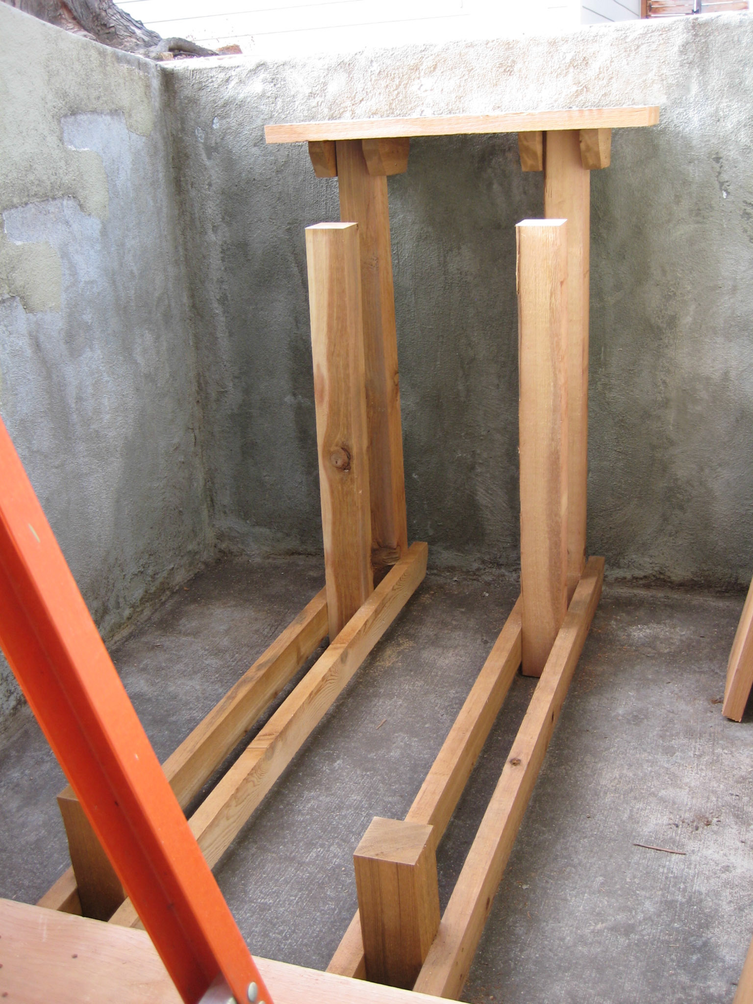 The 2x4s connect the posts together. Our house is a California Arts and Crafts bungalow, so I angled the ends of the 2x4s to stylistically match the knee braces in the gable ends of the house. All of the wood used is cedar. I used stainless steel hardware. No sealant or finish is used; the cedar has weathered to a nice silver.