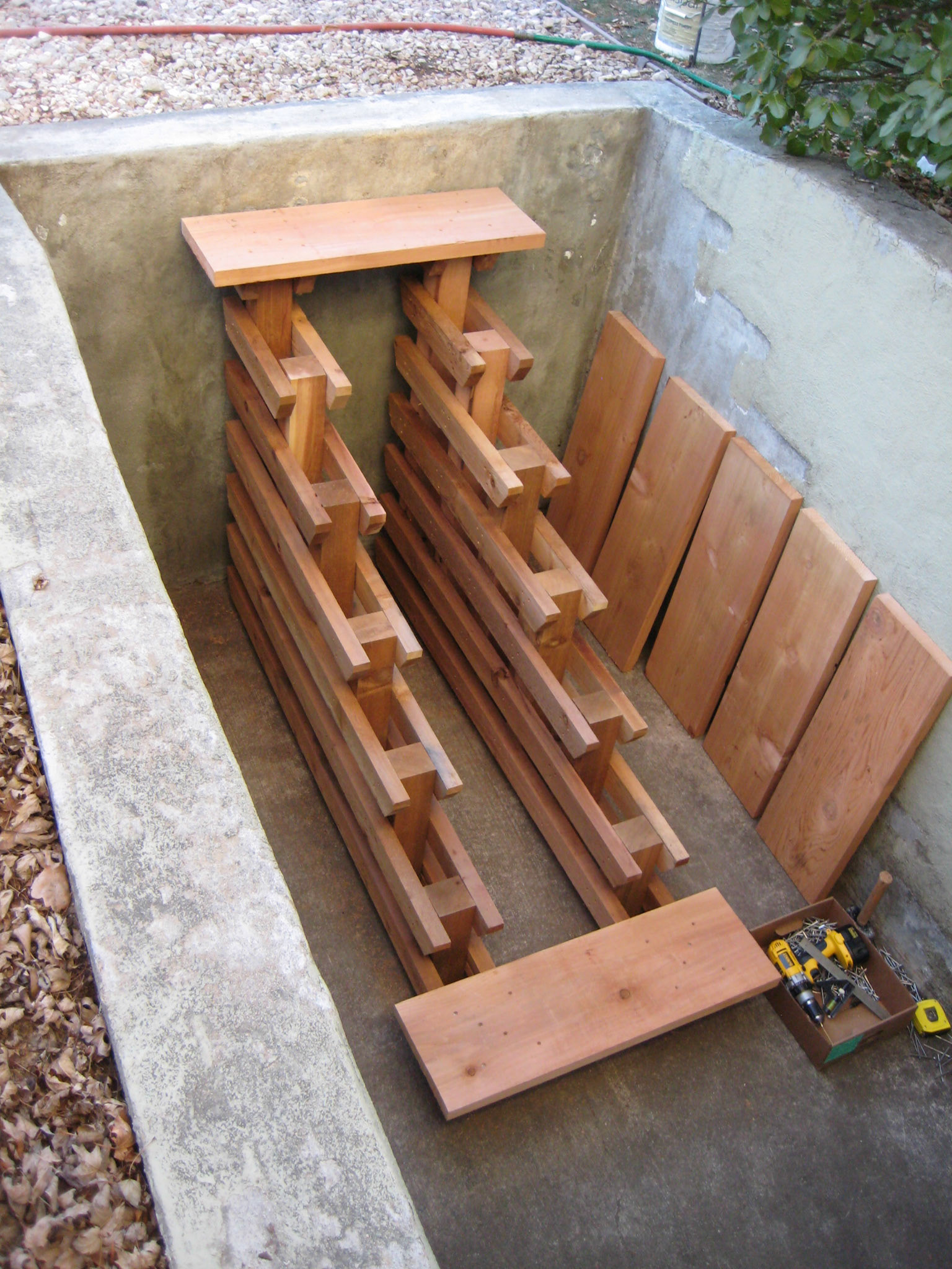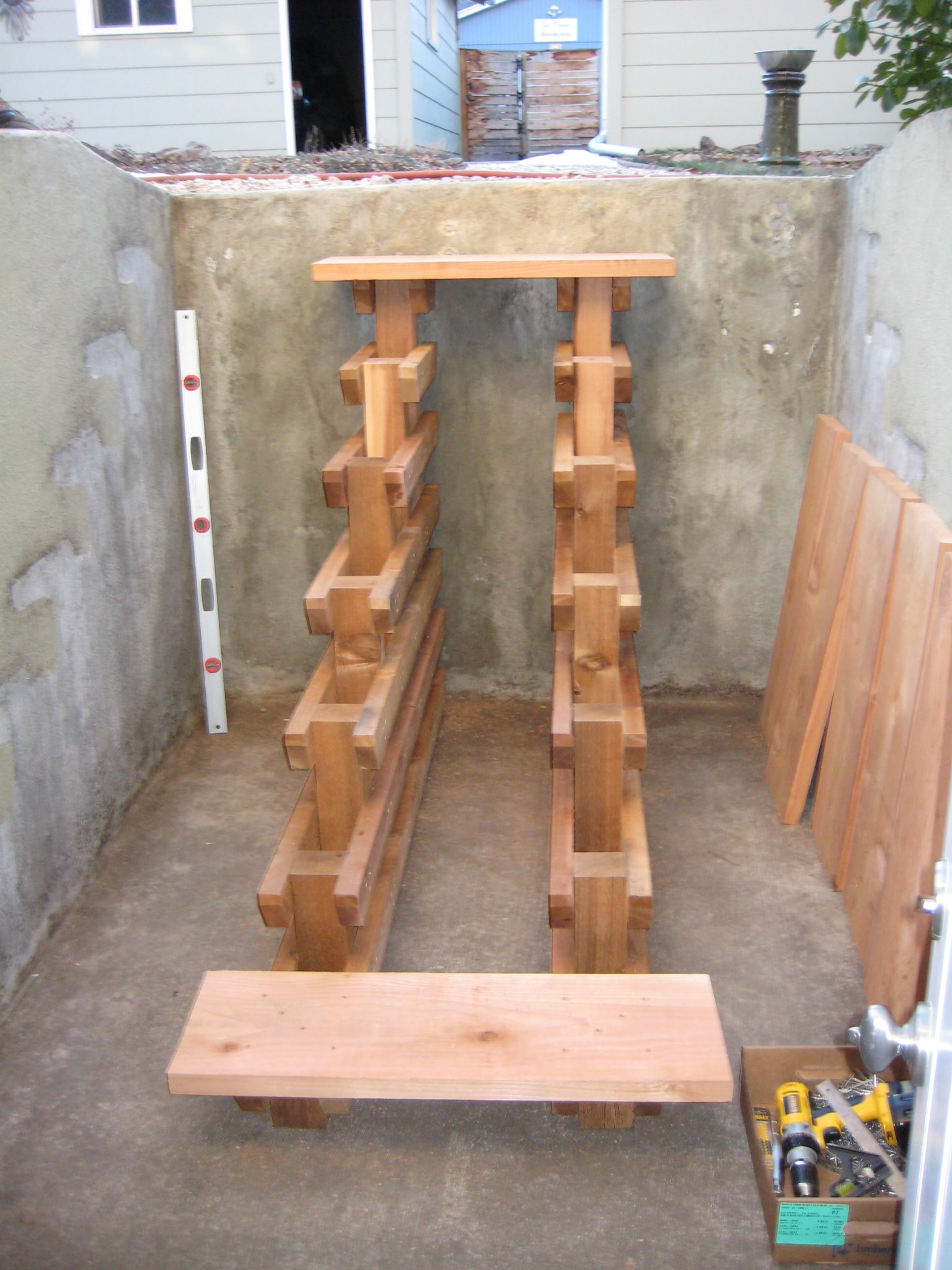 This is the walk-out stairwell to our basement. On the left wall, you can see where the previous set of stairs were; they went from wall to wall. With this being below grade, any moisture was largely trapped by the stairs. It was like a grotto. It was never dry and leaf litter from the large maple tree above would get under the stairs and rot. Since the stairs went wall to wall, there was no access from the sides to get the detritus out. Also, you can see the concrete walls have spalled and have efflorescence, two signs of deteriorating concrete due to excess moisture. For this reason, I needed to build stairs that would not be attached to any of the concrete, as its stability is questionable. So, standard stair construction techniques could not be used. As I demolished the old stairs, I found that the wood had rotted in many places. This was especially true on the treads because previous owners had covered the wood treads with plastic decking, trapping moisture even more.
